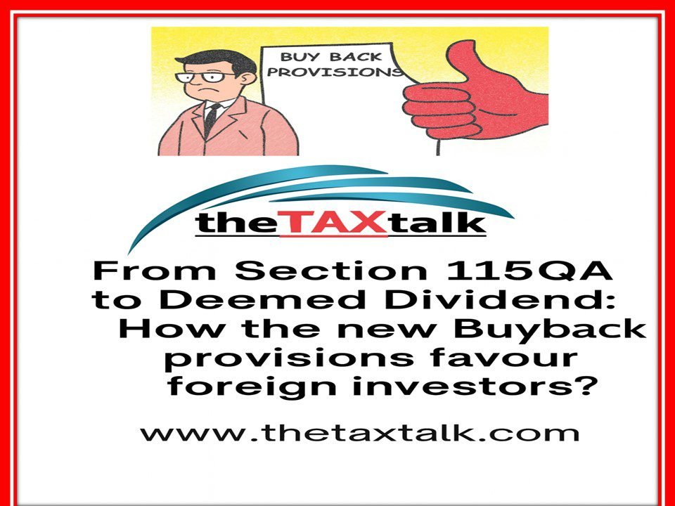 Income TaxFrom Section 115QA to Deemed Dividend: How the new Buyback provisions favour foreign investors?4 weeks agoFrom Section 115QA to Deemed Dividend: How the new Buyback provisions favour foreign investors? Buyback under earlier provisions: 1. …
