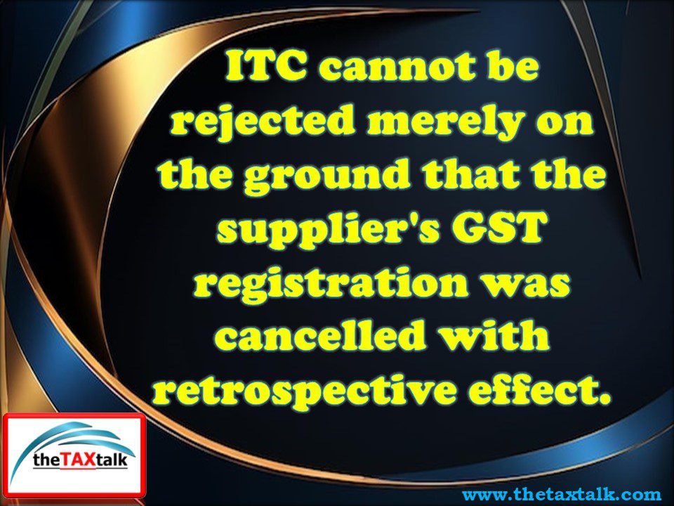 ITC cannot be rejected merely on the ground that the supplier’s GST registration was cancelled with retrospective effect.