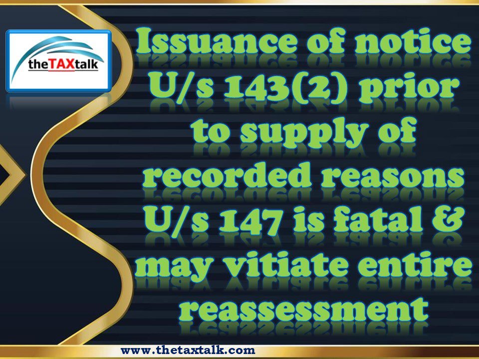 Issuance of notice under section 143(2) prior to supply of recorded reasons under section 147 has been held to be a fatal procedural lapse vitiating the entire reassessment. The ITAT (Delhi Bench) in Diamond Realcon Pvt. Ltd. v. ACIT accepted that even assuming reasons were later supplied, the prior 143(2) notice effectively denied the assessee a meaningful opportunity to challenge the very assumption of jurisdiction, thereby violating statutory safeguards and rendering the reassessment order invalid. Para 20