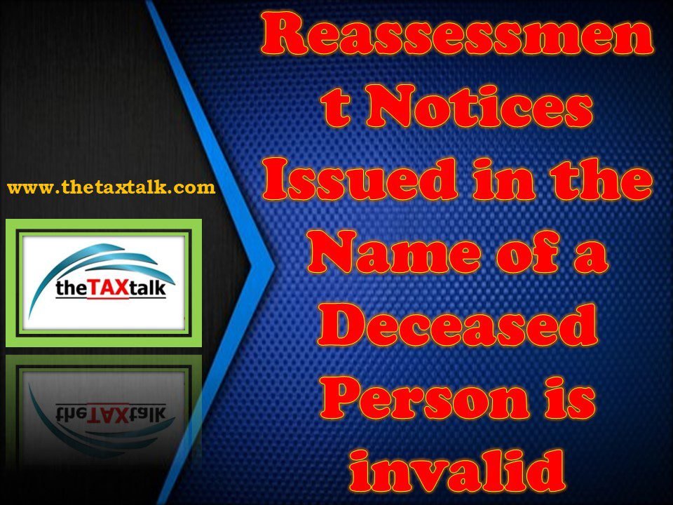 Income TaxReassessment Notices Issued in the Name of a Deceased Person is invalid4 days agoReassessment Notices Issued in the Name of a Deceased Person is invalid Reassessment Notices Issued in the Name of…