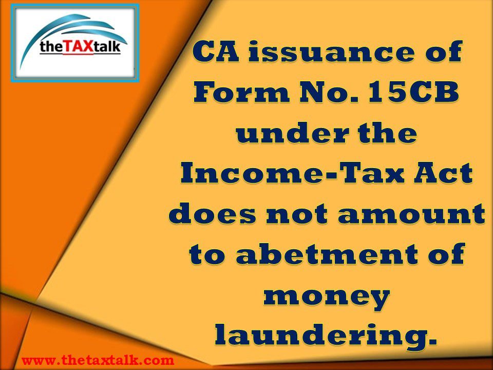 Income TaxCA issuance of Form No. 15CB under the Income-Tax Act does not amount to abetment of money laundering.4 days agoCA issuance of Form No. 15CB under the Income-Tax Act does not amount to abetment of money laundering. Supreme…
